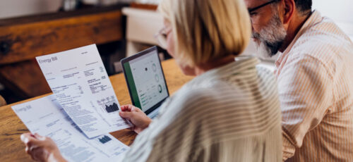 Senior couple carefully reviewing their household energy bill together on a laptop at home. They seem focused and concerned.