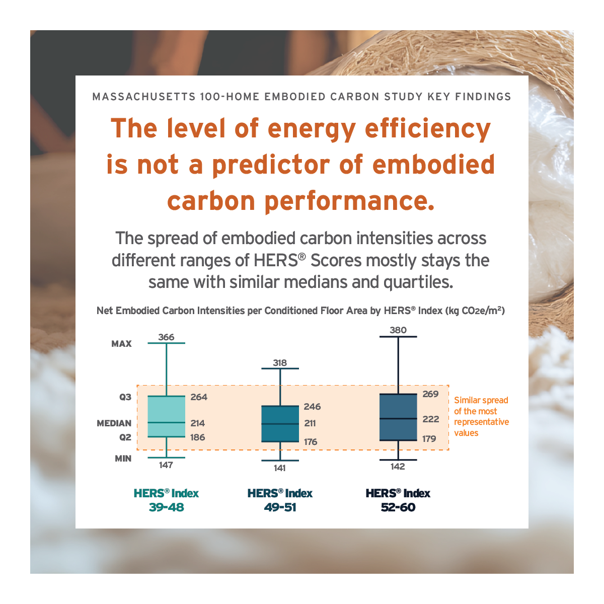 Instead, the study showed very little difference between the embodied carbon intensity of new homes, regardless of the HERS® rating. The median result of higher performing homes with a HERS® Index of 39–48 was nearly identical to the median results of homes with worse HERS® scores. In fact, the bulk of the embodied carbon results fell within very similar values, and even the embodied carbon outliers (those with particularly high or low embodied carbon intensities) were similar.